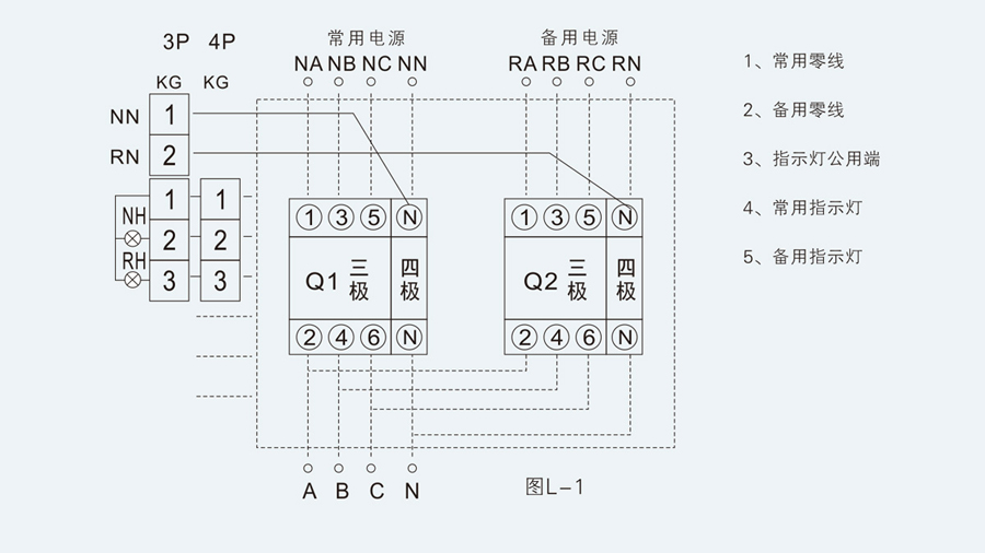 若選用斷路器為三極斷路器,則必須將常用電源(N)的零線NN和備用電源(R)的零線NR同時接到三極專用接零線端子KG上。具體操作 見接線圖。雙電源切換開關(guān)自動控制器的工作電源取斷取斷路QN和QR的進線端A相和零線N,若選用斷路器為三極斷路器時,必須要接零線NN 和NR,該三極專用接線零端子在兩臺斷路器中間,在自動電源切換開關(guān)安裝,接線過程中,切不要把原接在斷路器進線端的本機控制器線忘掉, 碰斷或短路等。