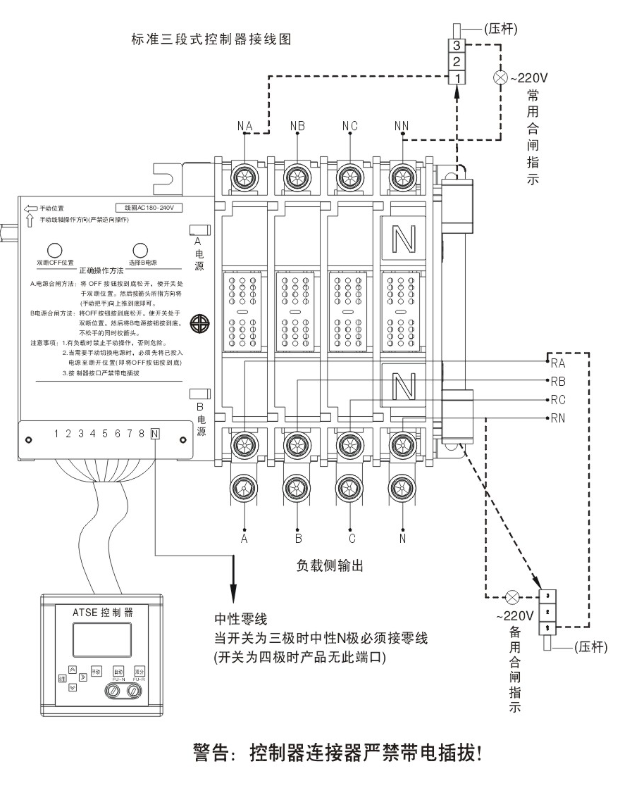 ?手動(dòng)切換調(diào)試,先按下雙斷按鈕使開(kāi)關(guān)處在雙斷位置,再將開(kāi)關(guān)的手柄按面板指示方向推 到位,此時(shí)為常用電源(N)合閘,然后按下脫扣按鈕,此時(shí)主備電源處于斷開(kāi)位置,然后按下主 備電源選擇按鈕(不松手)再將手柄按面板指示方向推到位,此時(shí)開(kāi)關(guān)為備用電源(R)合閘,主備電 源任一合閘另一電源都無(wú)法合閘,必須先按下脫扣按鈕,才能再次選擇主備電源的其中一種合閘。