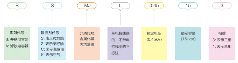 ◆訂購電容器時一定要按電容器型號標注方法正確訂購。例如380V網路容量l5kv&三相BSMJ電容器,訂貨時 應選型號:BSMJ-O.4-1 5-3。